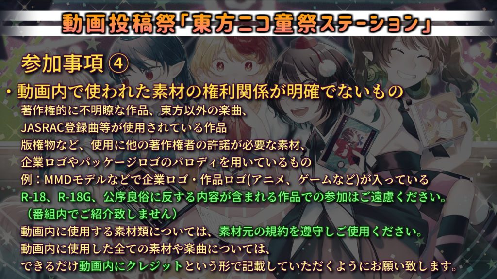 例:MMDモデルなどで企業ロゴ・作品ロゴ(アニメ、ゲームなど)が入ってしまっているもの・R-18、R-18G、公序良俗に反する内容が含まれる作品での参加はご遠慮ください。(放送中でご紹介致しません)