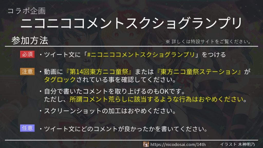参加にあたっては、第14回東方ニコ童祭特設Webページ内「動画企画」の「ページ内注意事項」を併せてご確認ください。