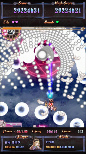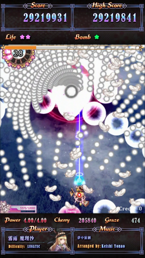 東方プロジェクトで大人気の主人公たちが幻想郷で暴動を起こして いる妖怪たちと戦う縦スクロールのシューティングゲームです。 武器は『ショット』と大ダメージを与える『スペルカード(ボム) 』 以外にもアイテムの取得と敵弾に接近する事で溜まっていくゲージ を消費することで展開できる『結界』を使い分けて、 道中の妖怪たちや各ステージのボスを沈静化していきます。 結界は展開中に敵弾にグレイズ(かする) ことでより長く維持することができ、 更なる高得点につながります。