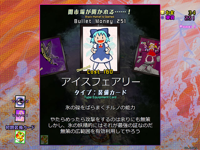 情報公開に合わせて合計7枚のスクリーンショットが公開されており、今回のストーリーにおける重要なワード「闇取引」が画面にも表示されています。「カード装備」「所持カード」と、今回のゲームが東方虹龍洞よりも「カードを集めること」に主軸をおいたゲーム性になっていることが伺いしれます。なかには「カード市場」という言葉もメニューには存在し、シューティングゲームパートに映る「お金」「弾貨」というワードが鍵を握っていそうです。