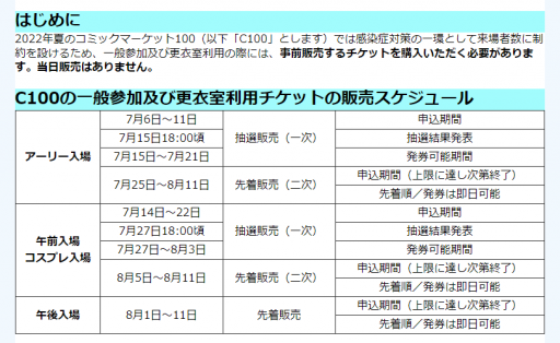 コミックマーケット100はすでに参加チケットの抽選が始まっており、午前入場チケットの抽選申し込みが本日7月22日まで。午後入場チケットの先着販売が8月1日から開始となります。午前中に入場するためには、本日までのチケット申込みが必須です!(販売数次第ですが、後日二次販売も行われる予定です)