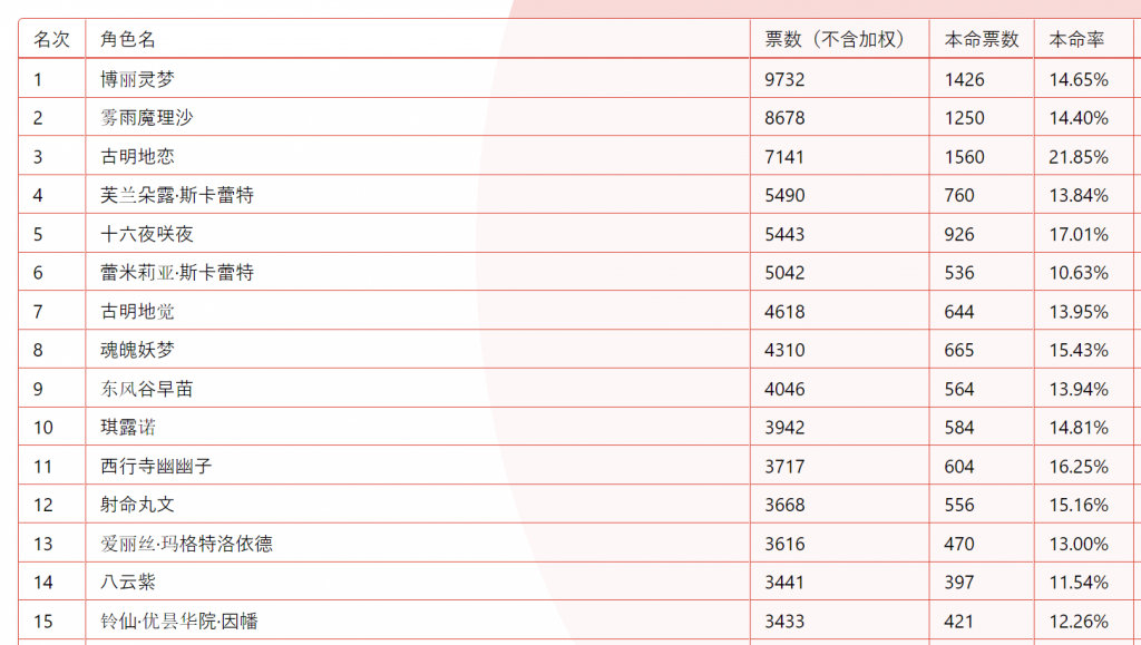 一部のキャラクター名は、一見すると読めないようなものも多いですが、「おそらくこのキャラだろう」と類推できるのも面白いところです(4位がフランドール、6位がレミリアです)。