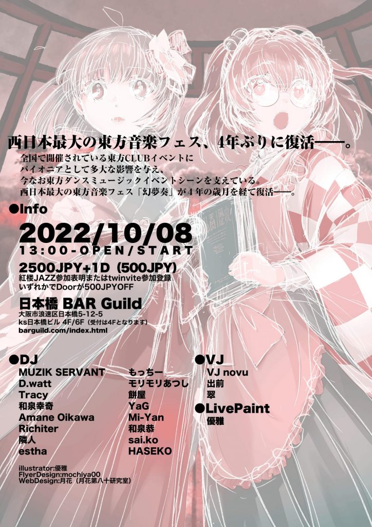 昨今のコロナウィルス蔓延の為、規模を縮小しての開催であるものの紅楼夢前日、西日本最大の東方音楽フェス「幻夢奏」が4年の歳月を経て復活――。関西では唯一の東方Jazz Liveイベント「紅楼Jazz」とコラボで「紅楼Jazz」に参加表明すると入場料が500円割引。