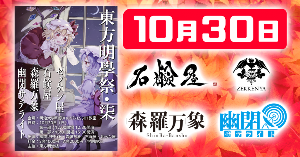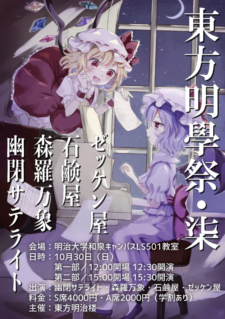 明治大学学園祭にて開催される『東方明學祭・柒』では、ゼッケン屋、石鹸屋、森羅万象、幽閉サテライトの4サークルが出演します。