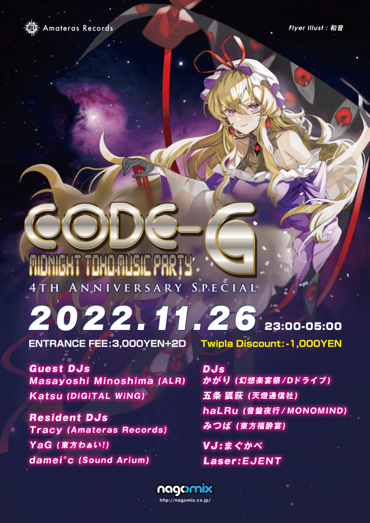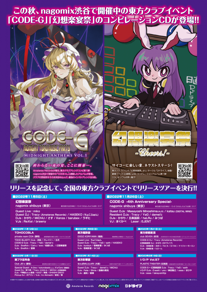 Amateras Records様より、東方Projectクラブイベント「CODE-G」「幻想楽宴祭」CD全国リリースツアーのお知らせをいただきました。