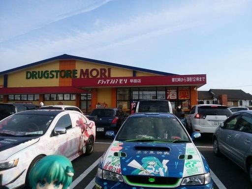 長崎県佐世保市早苗町にあるドラッグストアです。因みに右の早苗さんの痛車は私が所持しているもので、第十六回博麗神社例大祭にて展示しました。(ハンドルネーム:Desperado:01 さん)