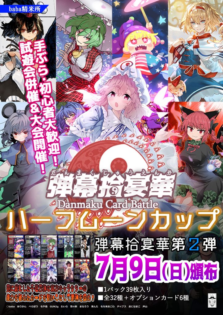 新感覚弾幕カードゲームバトル『弾幕拾宴華』の第二弾が、7月9日の博麗神社遊芸祭で頒布となります。また同イベントでは、前回に引き続きトーナメント大会「弾幕拾宴華ハーフムーンカップ🌗」も合わせて開催されます。