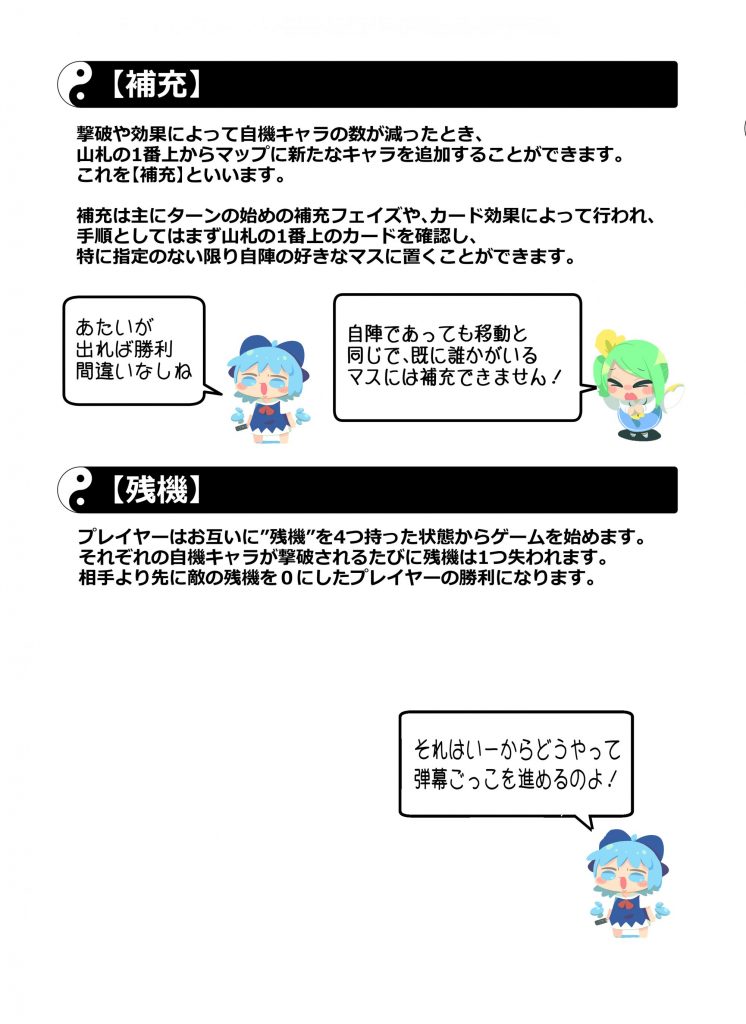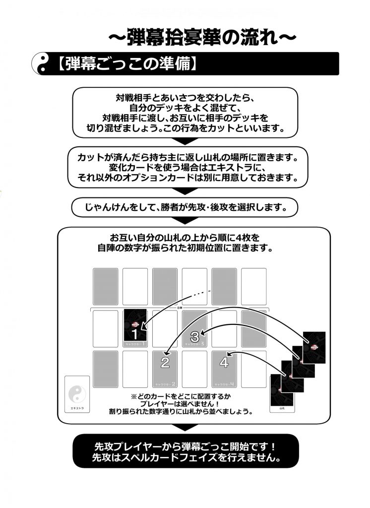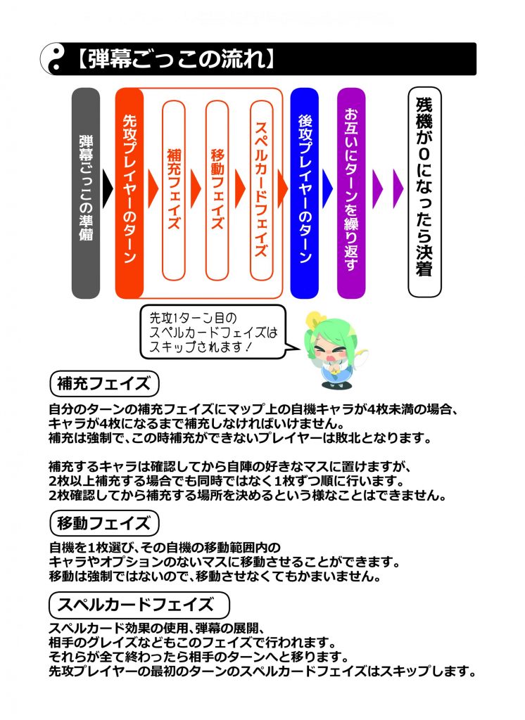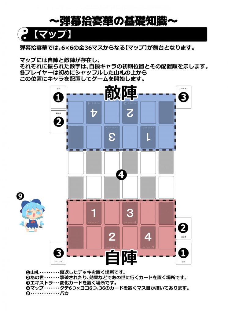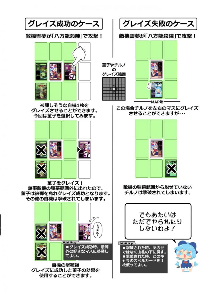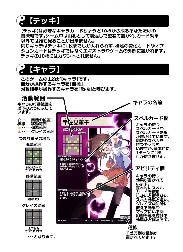 6×6の”マップ”に各々が自由に組んだ”山札”から”キャラ”を設置。フィールドを縦横無尽に”移動”させながら”スペルカード”で弾幕を撃ったり敵キャラの弾幕を”グレイズ”で回避。