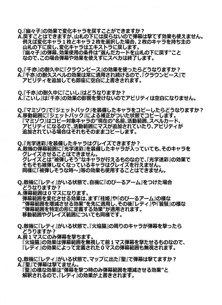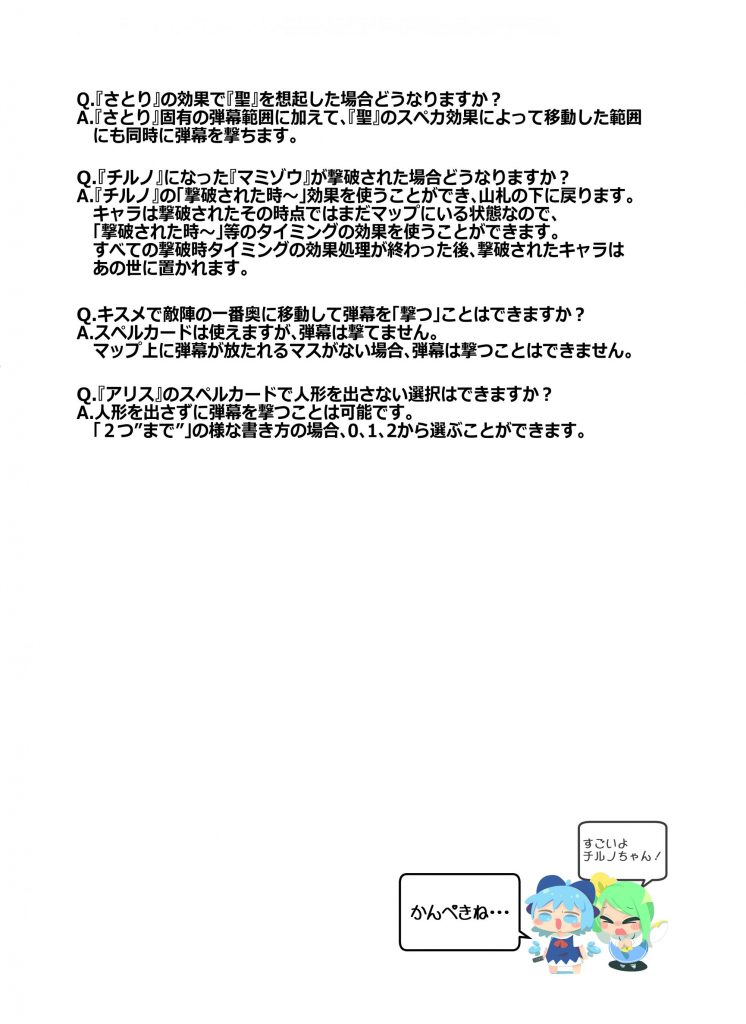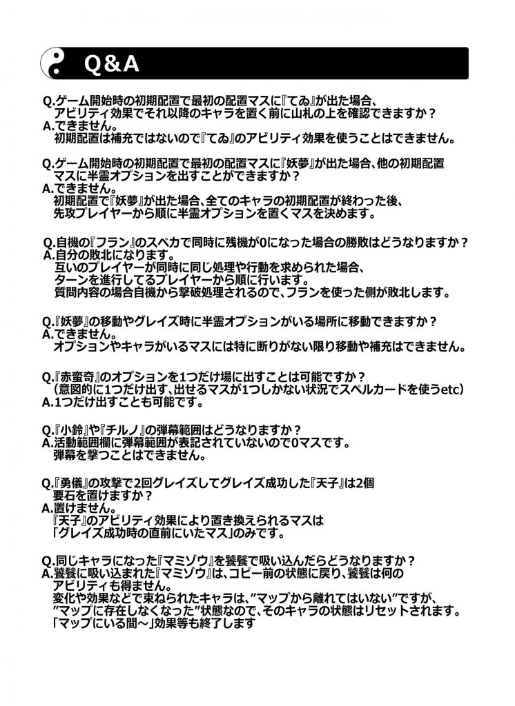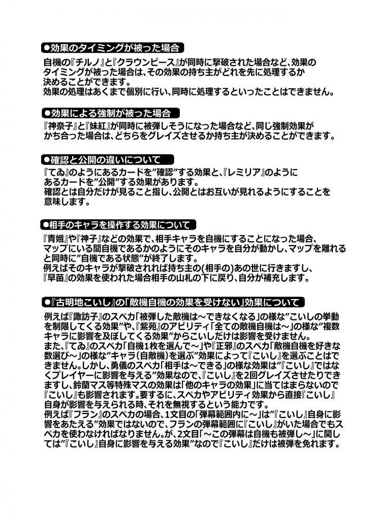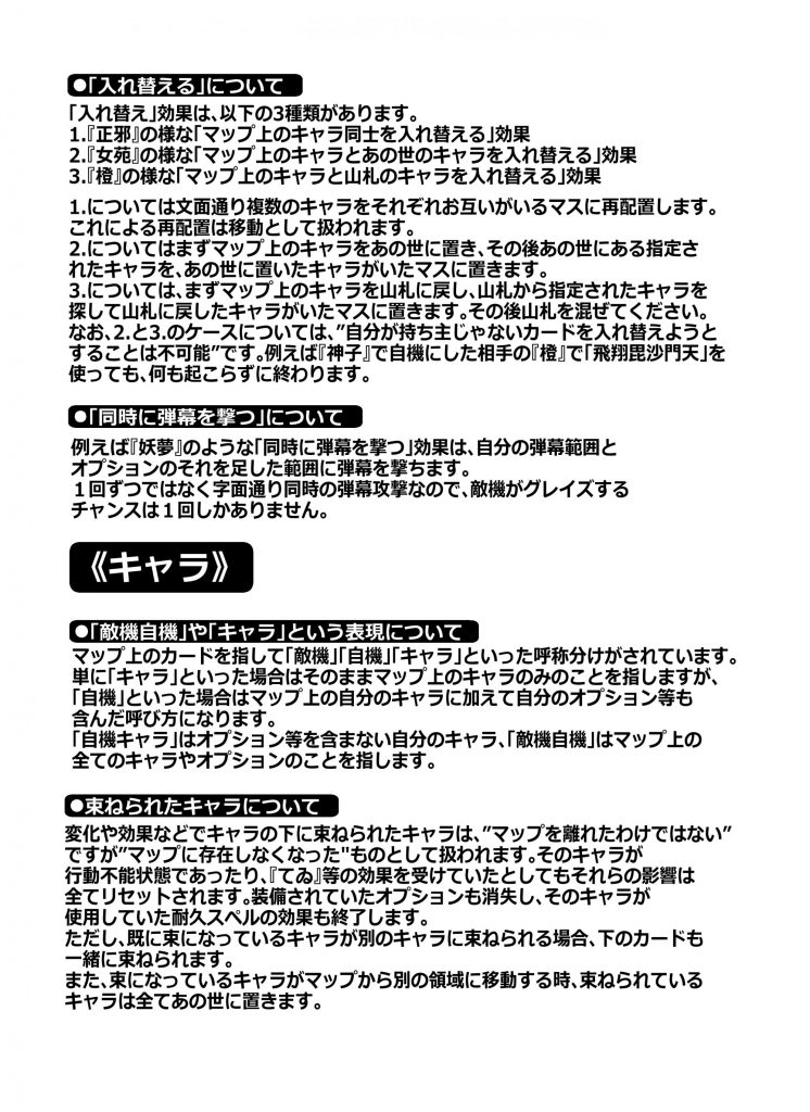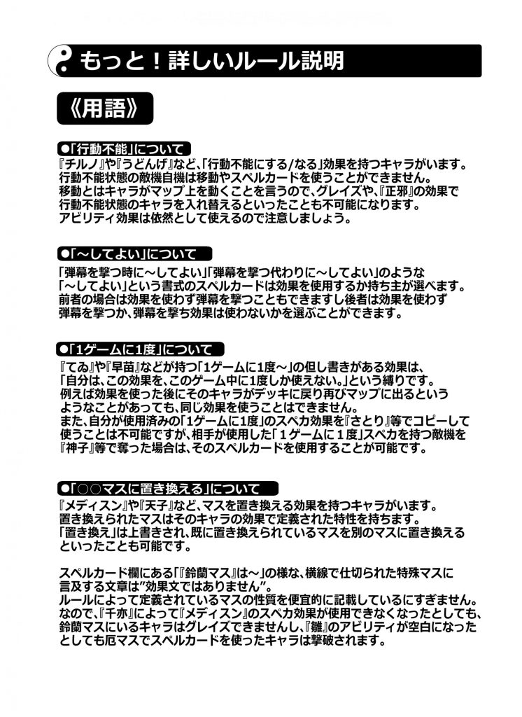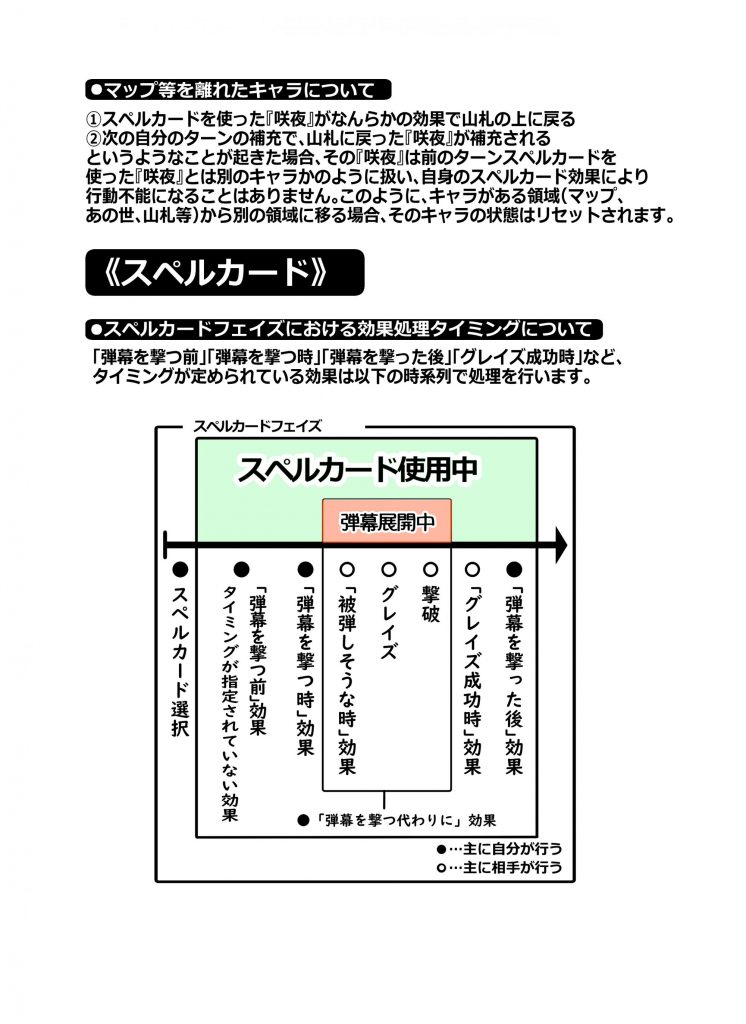 6×6の”マップ”に各々が自由に組んだ”山札”から”キャラ”を設置。フィールドを縦横無尽に”移動”させながら”スペルカード”で弾幕を撃ったり敵キャラの弾幕を”グレイズ”で回避。