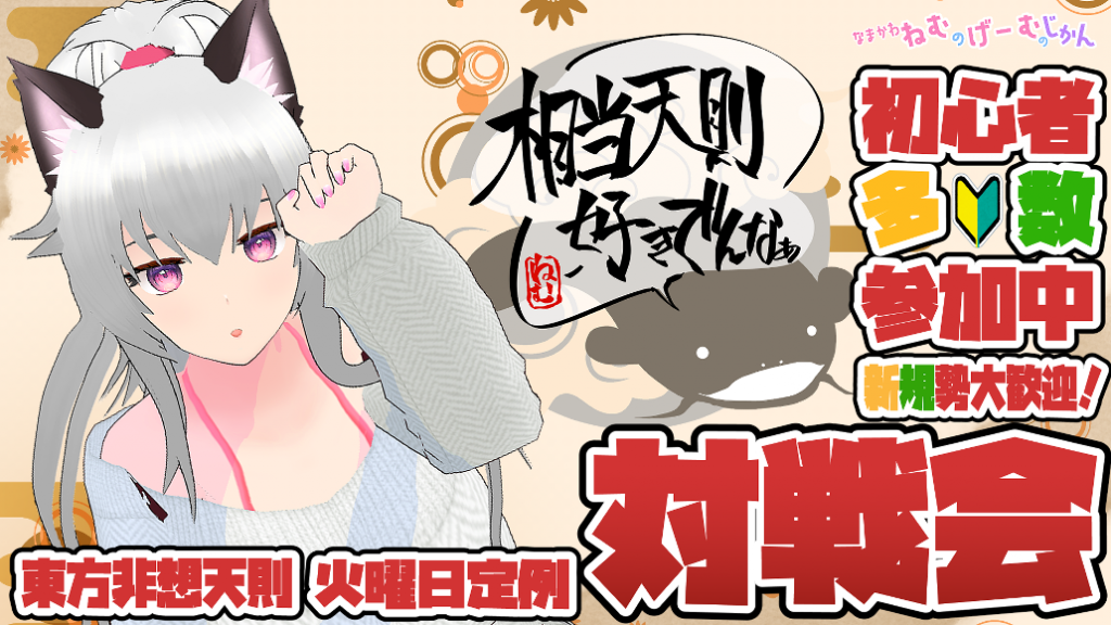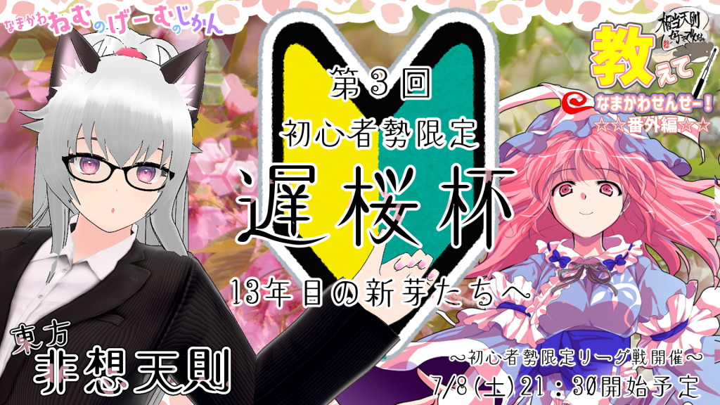 なまかわねむちゃんねる様より、東方非想天則の初心者限定大会『遅桜杯』のお知らせをいただきました。