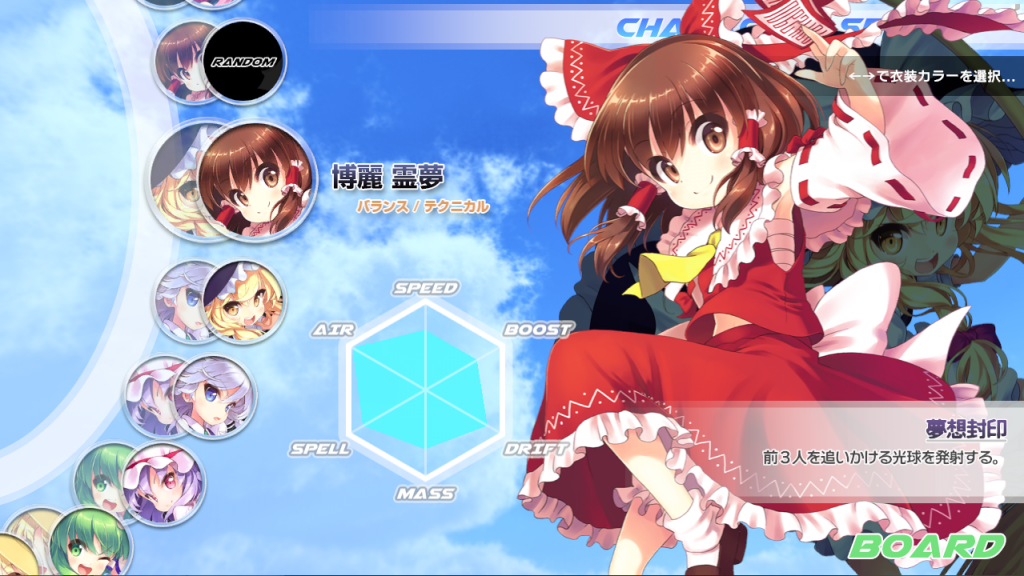 『幻走スカイドリフト』は2人のタッグを選んで幻想郷を駆け巡る、東方Project二次創作レーシングゲームとなります。