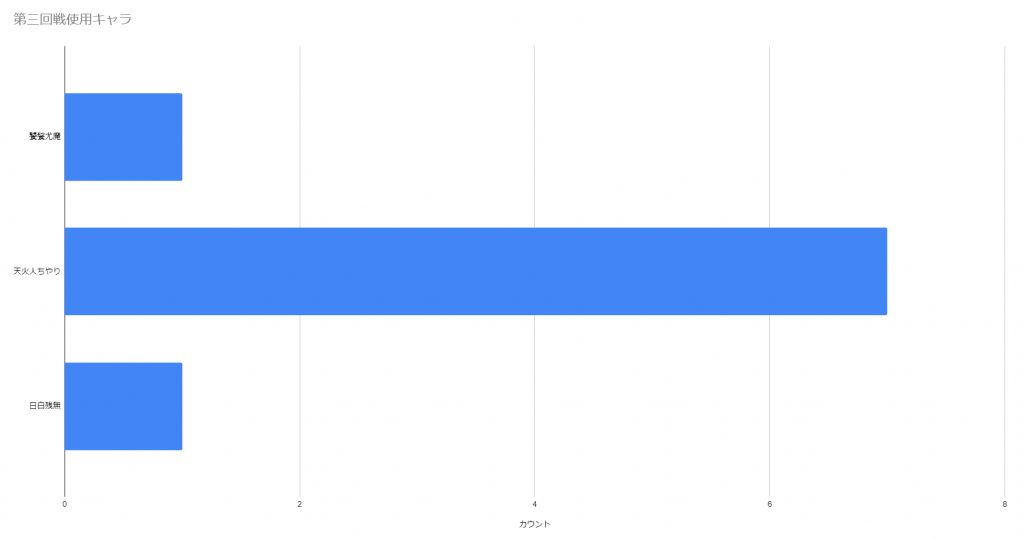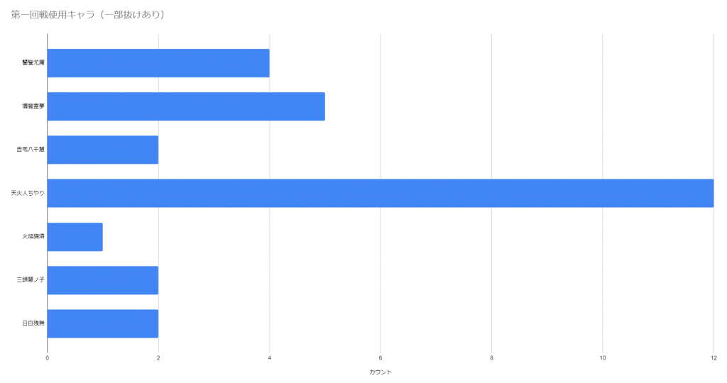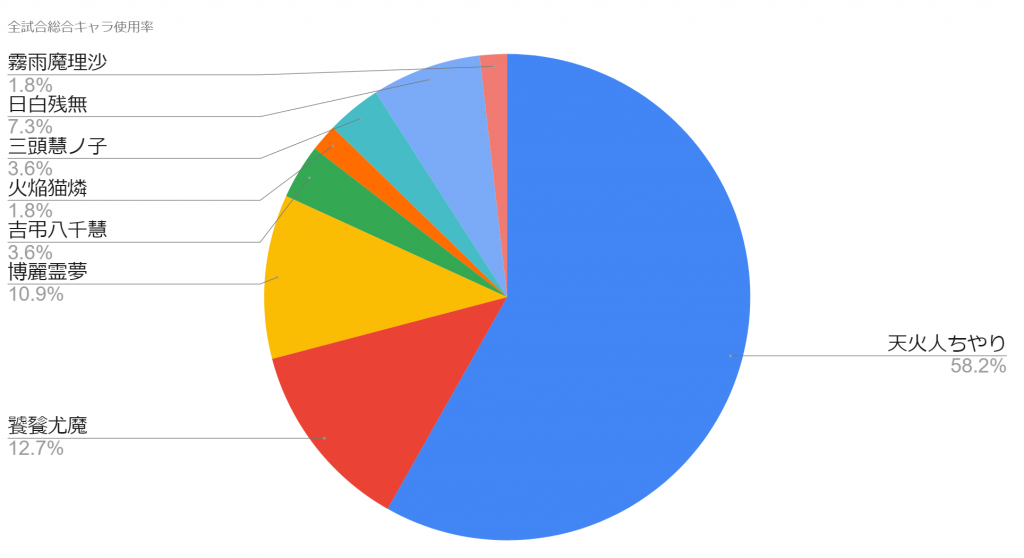 使用キャラ一位は、獣王園を遊んだ人なら誰もがわかる「ヤバい」新キャラ、天火人ちやり。各回戦ごとに使用キャラが変えられる大会ルールにも関わらず、第一回戦~第三回戦すべてを総合した使用率は58.2%。ちやりミラーの対戦が第一回戦から頻出する結果となりました。