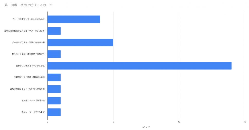 次に使われたのは「チャージ速度アップ(けしかける狛犬)」と「ゲージでボム入手(攻撃こそ地獄の華)」。今回のゲームシステムの肝である「チャージアタック」と相性がいい能力が選ばれる傾向にありました。