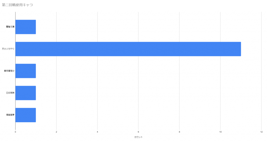 その他のキャラでは、饕餮尤魔、博麗霊夢、日白残無が人気。ベスト4に勝ち残った雪だんご選手は、最初から最後まで饕餮尤魔を選択。予選会で唯一4勝してシード権を勝ち取りました。