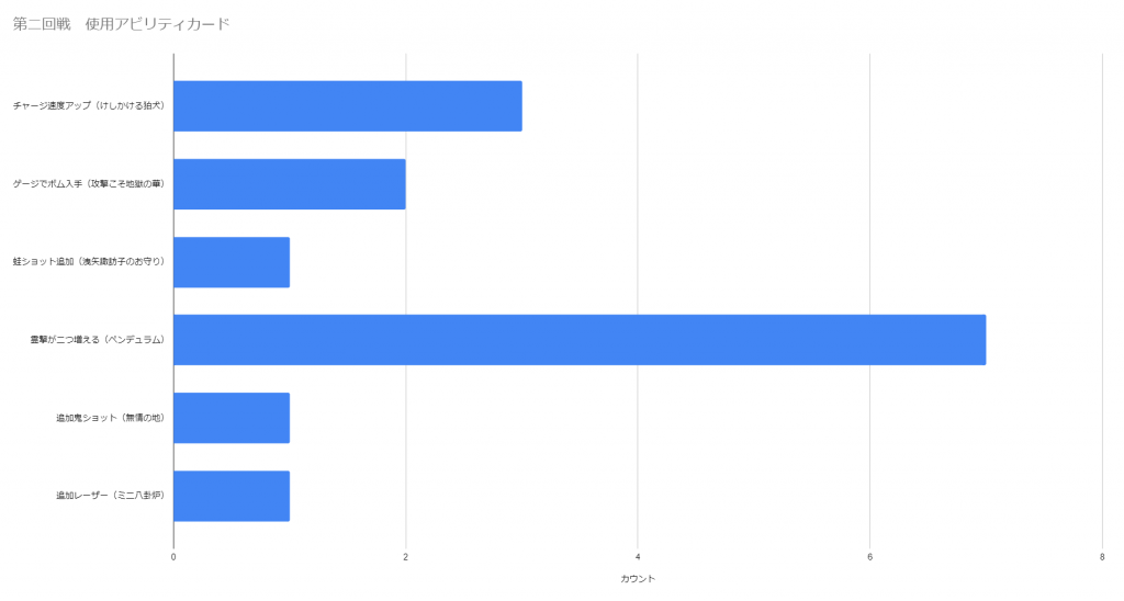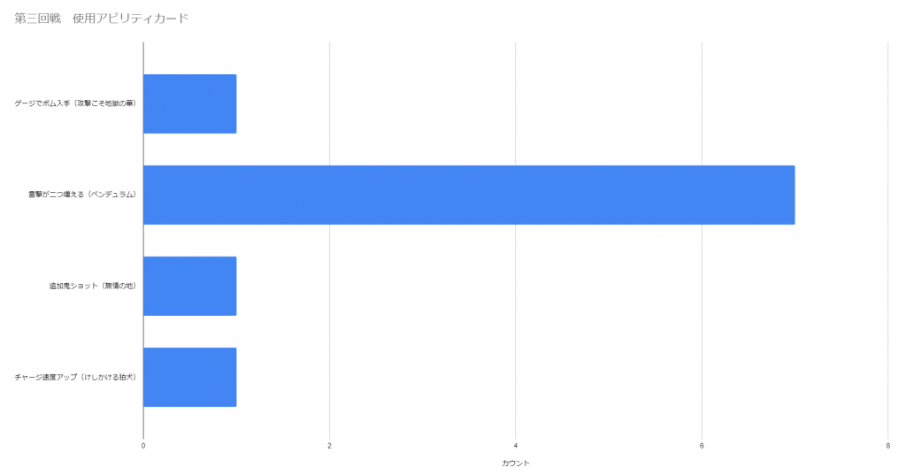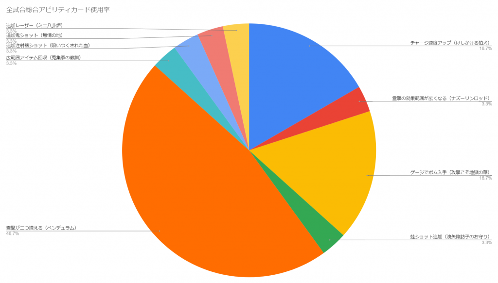 使用アビリティカードの一位は「霊撃が二つ増える(ペンデュラム)」で、使用率は(全試合総合で)46.7%。単純にボムが二つ増える効果は、どのキャラを使用してもその効果が腐ることがないのが魅力です。
