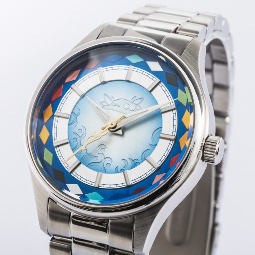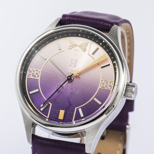 紫の持つ傘のリボンをイメージしたデザインが盤面の縁を彩り、まるで明けることのない夜の様な色をした盤面から、紫がこちらに移動してくる様な印象を与える腕時計。