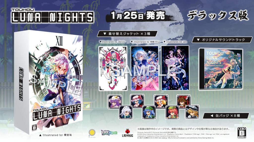 デラックス版には、サウンドトラックに加え、東方 Project の美麗なイラストに定評のある榎宮祐氏による豪華ボックス、3 人のイラストレーターによる着せ替えジャケット 3 枚、そして登場キャラクターのドットアイコンイラスト缶バッジ 8 種が同梱し、より深く『Touhou Luna Nights』の世界観をお楽しみいただけます。デラックス版は完全初回生産限定となりますので、品切れにご注意ください。