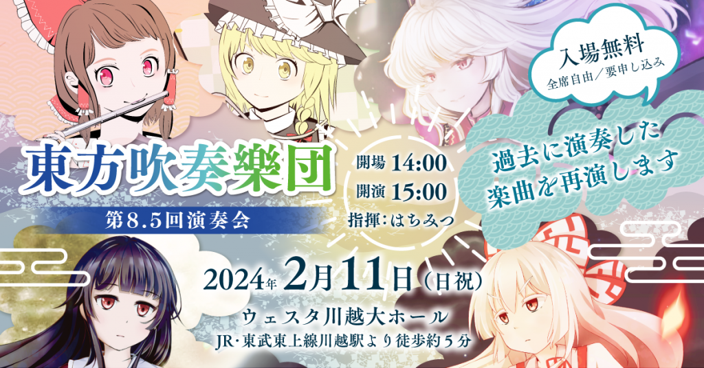 東方projectの楽曲のみを吹奏楽アレンジして演奏する、東方吹奏樂団の第8.5回演奏会が2024年2月11日(日祝)に、埼玉県川越市にあるウェスタ川越 大ホールにて開催されます!