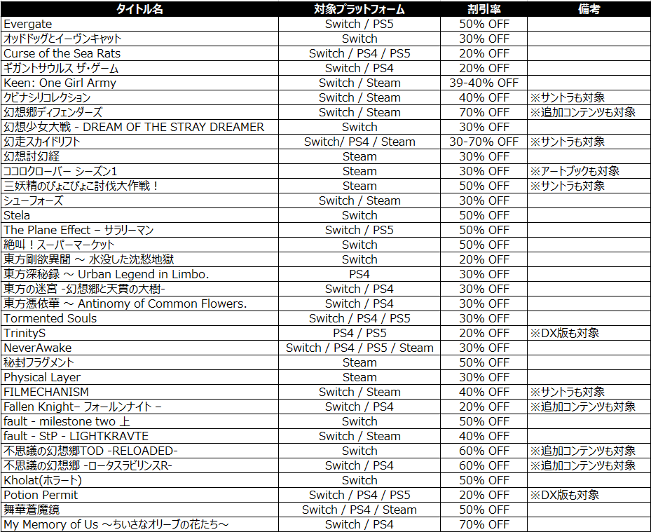 3月15日(金)から3月22日(金)までの1週間、Phoenixxタイトルが最大70%OFFとなるセールです。東方タイトルが多数対象となっております。