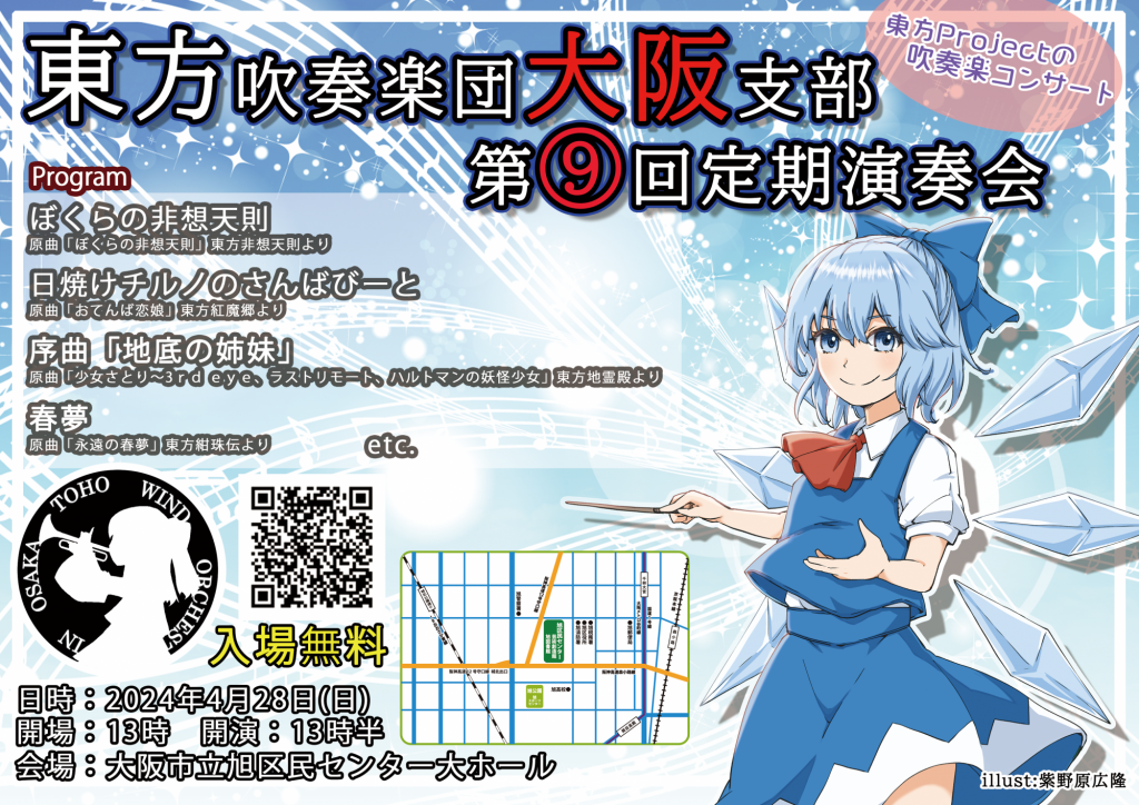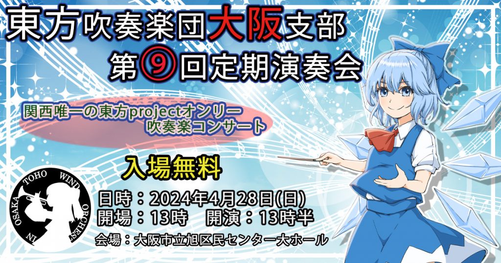 関西で唯一の東方Projectシリーズの音楽の吹奏楽コンサートが2024年4月28日(日)に大阪市で開催されます。演奏するのは大阪を中心に東方Projectの音楽の演奏活動をしている東方吹奏楽団大阪支部です。誰でも楽しい演奏会をモットーに10年以上活動し、今回はチルノをイメージキャラクターとして演奏会を作り上げました。馴染みのある曲や、聞いたことのないアレンジを楽しめるイベントとなっておりますのでぜひ会場にお越しください。