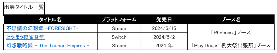 Phoenixx ブースならびに Play,Doujin! 例大祭出張所ブースでは、「東方 Project」二次創作作品である『不思議の幻想郷-FORESIGHT-』『とうほう夜雀食堂』『幻想戦略録 – The Touhou Empires -』ら3タイトルを試遊いただけるほか、キャラクターの等身大パネルに彩られたフォトスポットや“リアル夜雀食堂”など、来て・見て・遊んで楽しいブースをご用意しております。