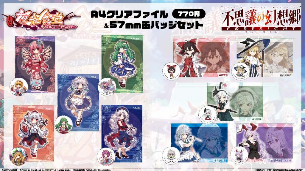 当日Phoenixxブースにお越しいただき、指定のSNSアカウントをフォローいただいた方へ、『とうほう夜雀食堂』のオリジナルクリアファイルをプレゼントいたします。数に限りがございますので、お早めにブースまでお越しください!