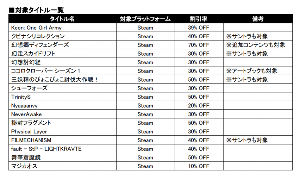 ※一部タイトルでセール期間が異なる場合があります。ご購入前に各ストアにて割引状況をご確認ください。Steam: