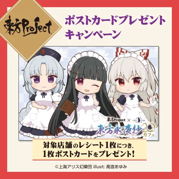 期間中、〈第二十一回博麗神社例大祭〉ほか対象店舗のレシートを持ってCURE MAID CAFÉ(キュアメイドカフェ)に行くとポストカードをプレゼント!