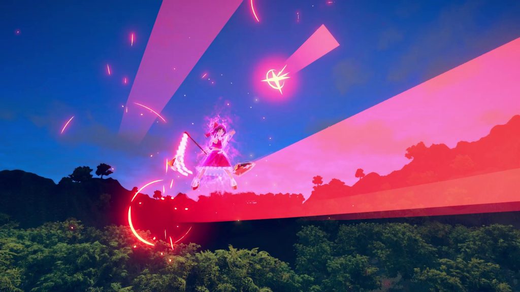 空を自在に飛び、迫り来る弾幕を避けてスペルを放つ…