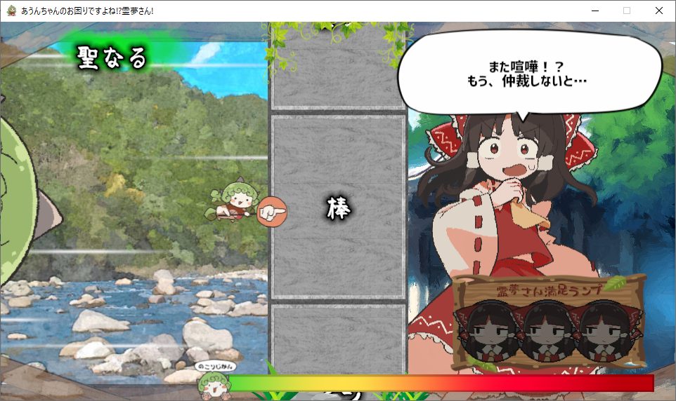 例えば、霊夢が喧嘩を仲裁するときに、「聖なる」+「棒」の組み合わせでスロットを止めると、あうんちゃんは「お祓い棒」を持ってきて霊夢に手渡します。喧嘩両成敗!