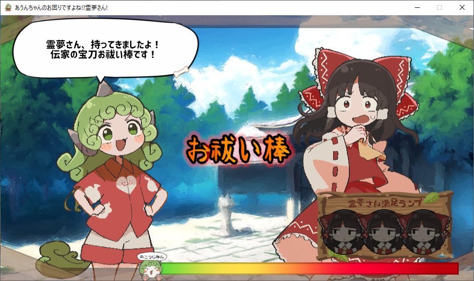 霊夢の様々な悩みを感じ取ったあうんちゃんが、あちこちを駆け回って見つけたものでお困りごとを次々解決するストーリーです。