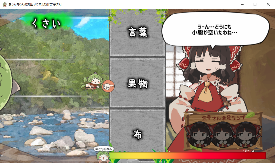 持ってきたものが霊夢に役立つものだと、それに応じて右下の満足度ランプが点灯します。