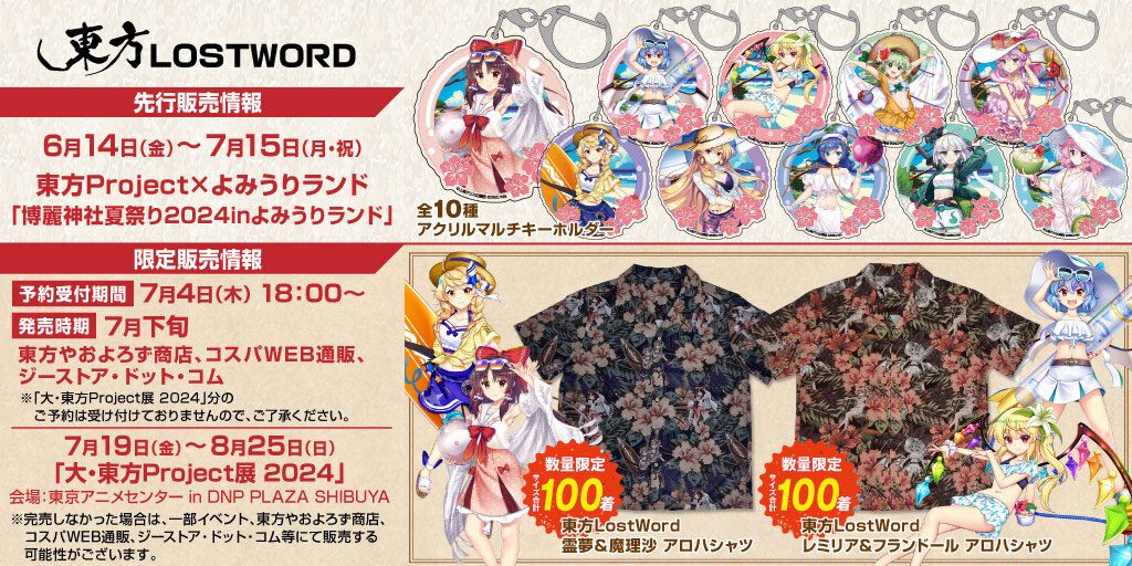 数量限定100着『東方LostWord』霊夢&魔理沙、レミリア&フランドールの「アロハシャツ」が登場、7/4(木)18時~予約受付開始!イベント分先行販売も