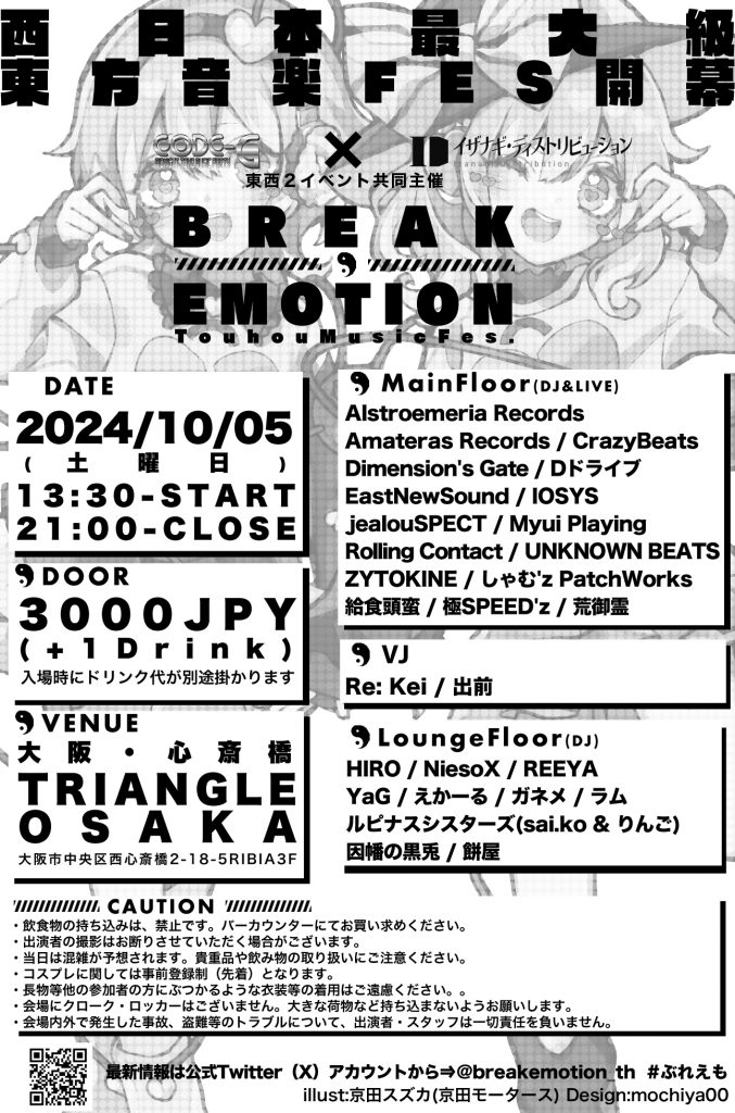 「BREAK EMOTION -Touhou Music Fes.-」は西日本最大級の東方音楽フェスとして紅楼夢前日に開催されます。