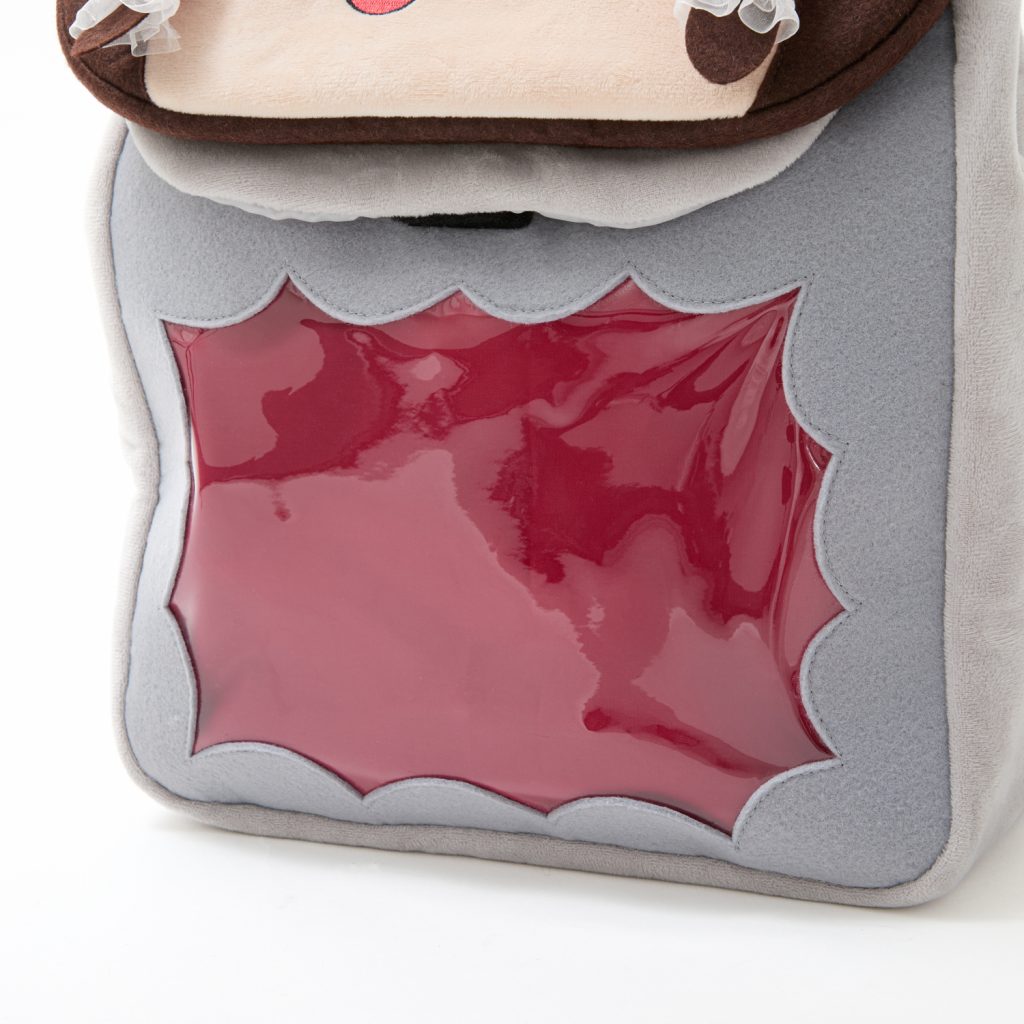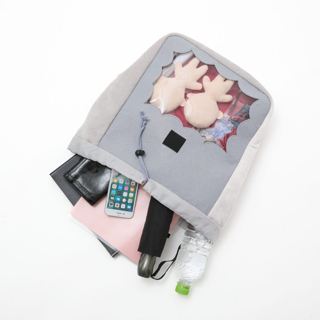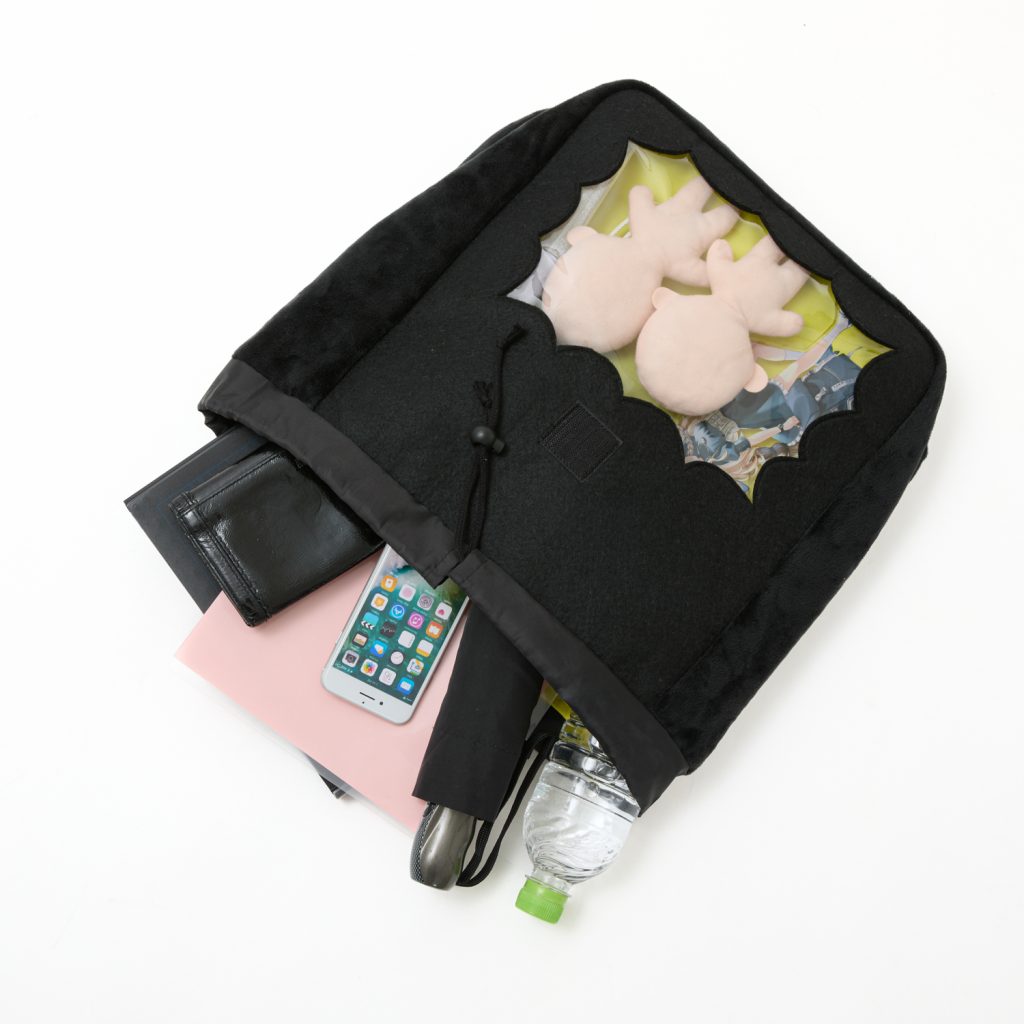 フロント部分は吹き出し型のクリア窓。お気に入りのグッズをディスプレイしながら持ち歩けます。