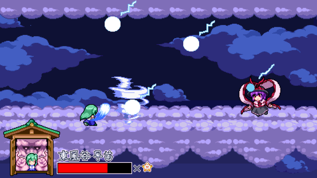 本作は、東方Projectのキャラクター「東風谷 早苗(こちや さなえ)」を主人公とした2Dアクションゲームです。