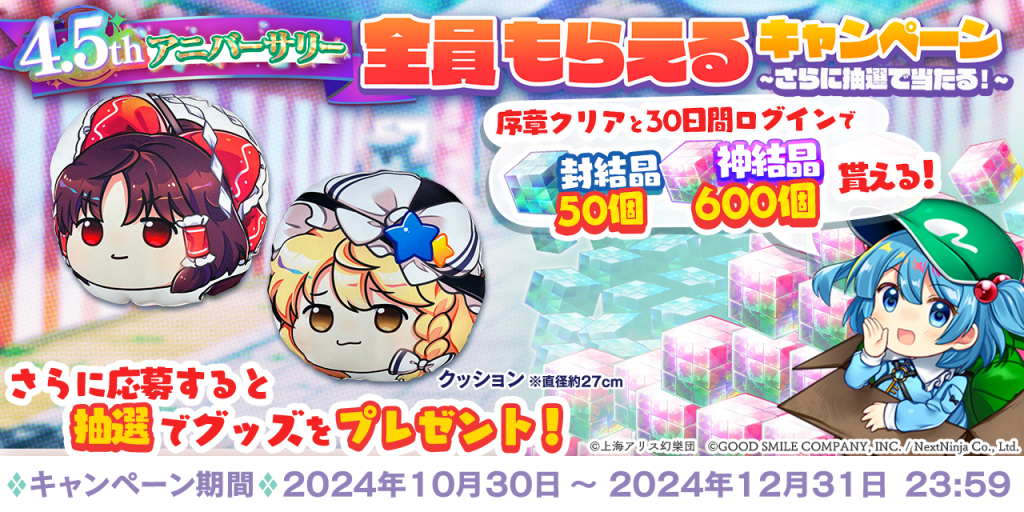 実施期間中に「序章クリア」&「合計30日間ログイン」で、全員に「神結晶」をプレゼント!さらに、東方LostWordのクッションが抽選で当たりますので、ぜひ奮ってご参加ください。