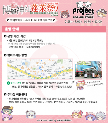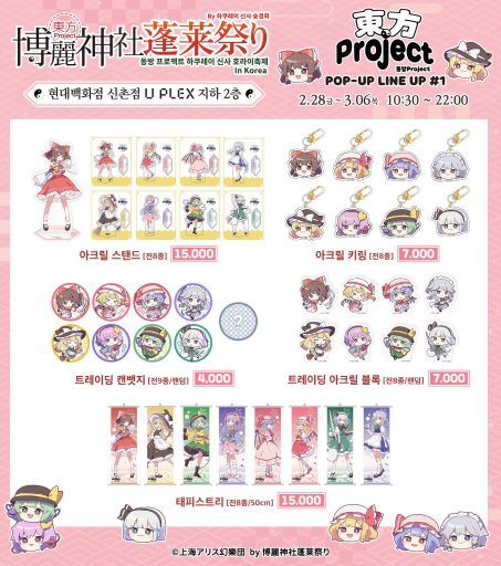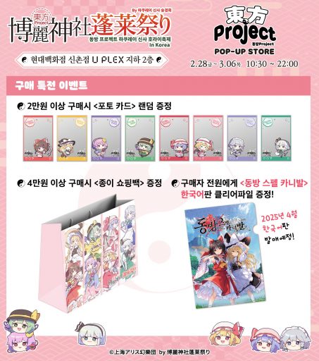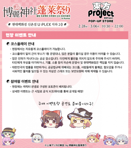 東方Projectの世界観を体感できるポップアップストア「博麗神社蓬莱祭り」が韓国・ソウルに初登場! 本イベントでは、博麗神社崇敬会と協力して、韓国オリジナルグッズの販売、展示、東方ファンが楽しめるさまざまな企画を実施いたします。