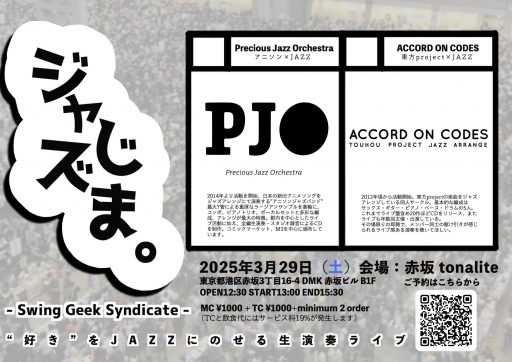 『ジャズじま。 – Swing Geek Syndicate』ということで、いよいよ3月末に開催せまる、東方ジャズ×アニソンジャズの初ツーマンライブです。
