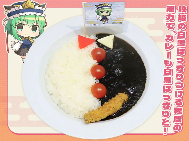 白黒はっきり盛り付けたカレーライスに、映姫の持っている悔悟の棒に見立ててスティック状のフライドチキンを盛り付けて完成です。