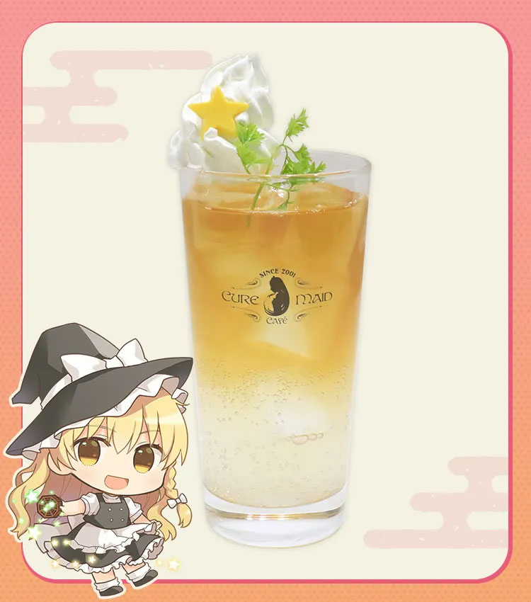 [博麗神社のりんご煎茶+桜シロップ+ホイップクリーム+リボンチョコ+赤ストロー]〇霧雨魔理沙[魔法の森のフルーツキャンディティーアレンジ・マスタースパークリングティー]