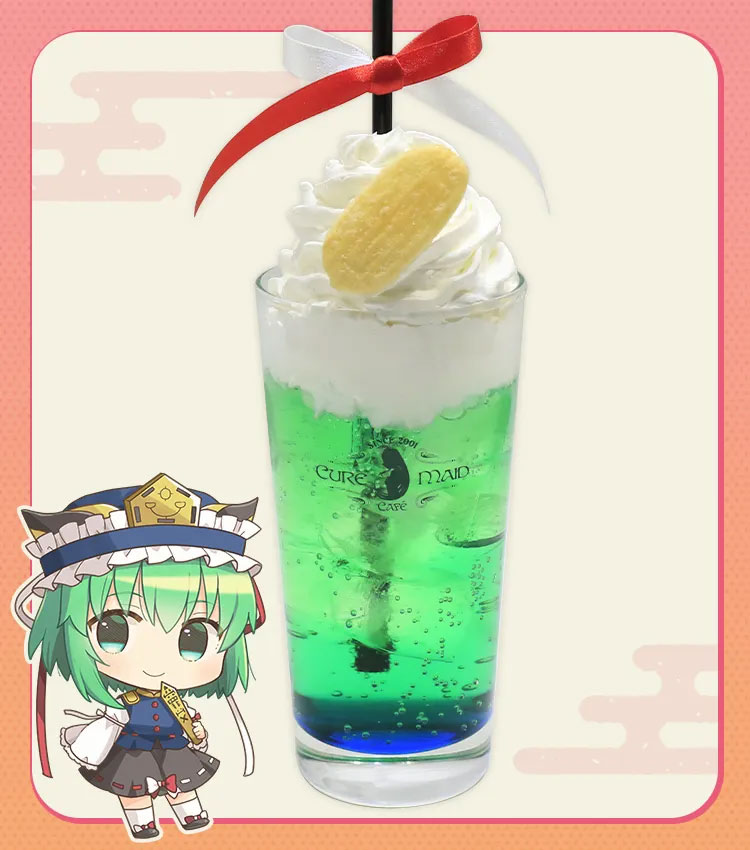青い衣装と緑の髪色をブルーキュラソーシロップとメロンソーダで表現。
