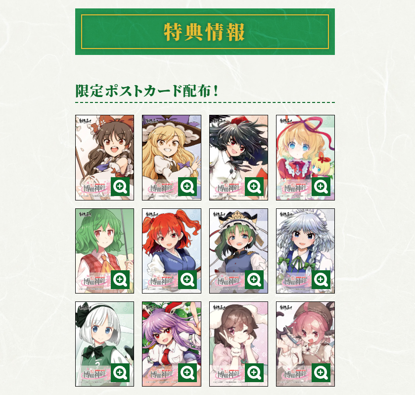 期間中、開催会場にて商品お買い上げ1,500円(税込)毎にランダムで「博麗神社~春祭り2025」オリジナルの東方Projectポストカードをプレゼント!