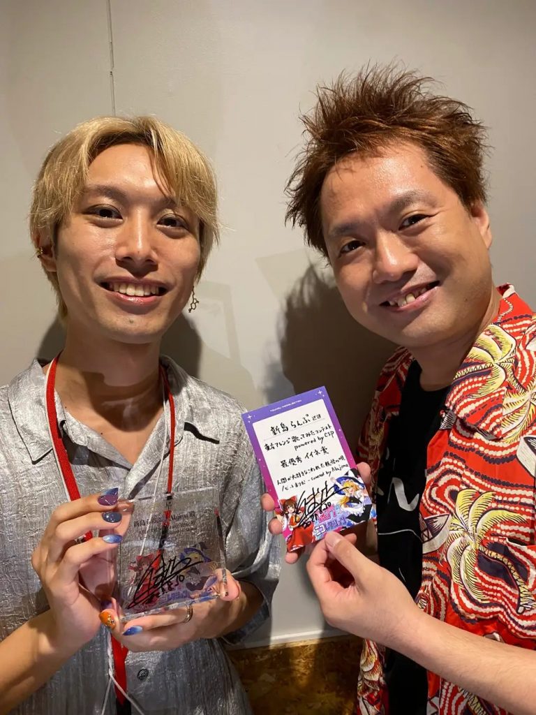 そこに、ステージ袖でこっそり聞いていた本家のビートまりおさんがサプライズで登場。「表現力とか、ファルセットとかめちゃくちゃ上手いですね!作った当初から表現力や感情が大事な曲だと思っていて、今回の歌唱は感情が乗っていて良かったです。歌ってくれてありがとうございました!」と大絶賛。そして記念品の盾をビートまりおさんから直々に授与され、新島さんは満面の笑みで応えました。この様子は、YouTubeとニコニコで生配信されました。