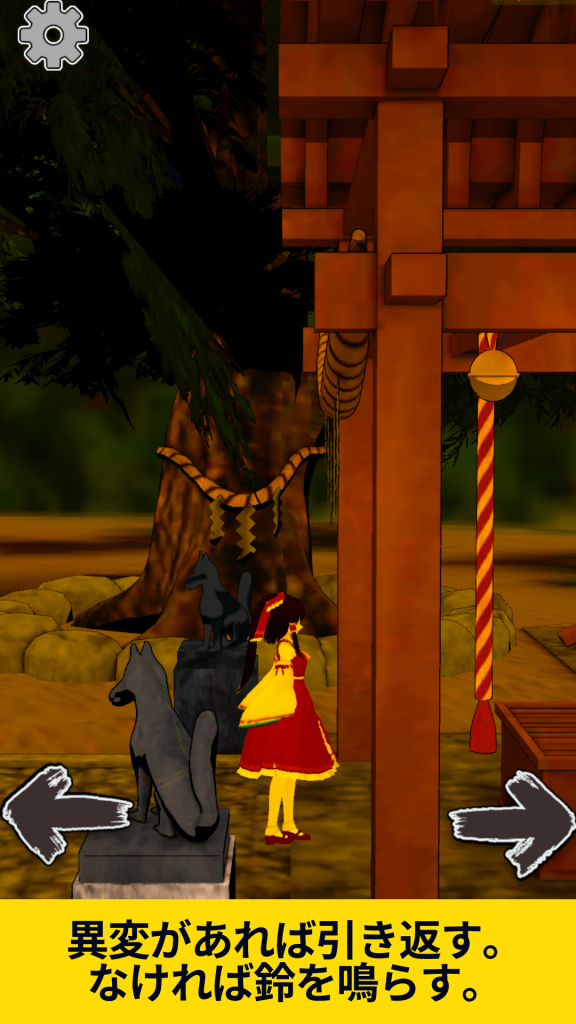 プレイヤーは博麗霊夢となり、同じように見える参道を何度も往復しながら、「さっきとどこかが違う」“異変”の有無を見極めていきます。 異変が「ある」と思ったら、鳥居の外まで引き返す