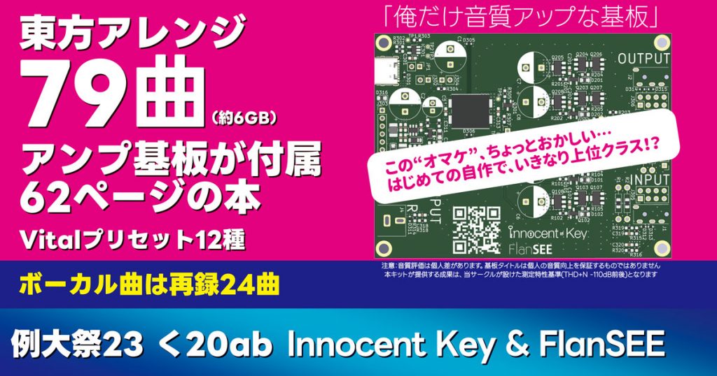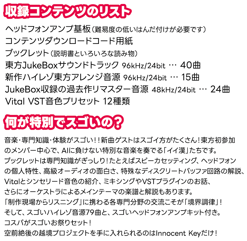 東方我楽多叢誌をご覧の皆様へ、おまたせしました、ここから作品の紹介です。新譜は東方アレンジ「境界調律」です。今回は、新作15曲を含むハイレゾ東方アレンジ79曲と大ボリュームはもちろんのこと、本格的な性能を持つヘッドフォンアンプ基板キットが付属しています。昔の電波曲中心だったInnocent Keyじゃなくて今のInnocent Keyだからできる特別な企画です。