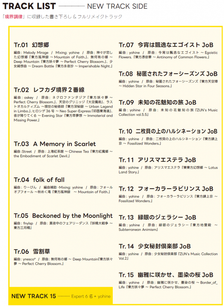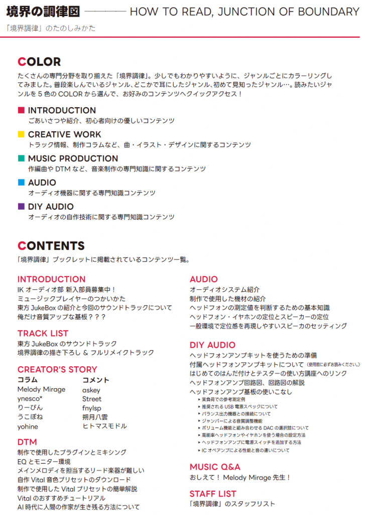 東方アレンジは出会いのきっかけです。境界調律は東方音楽のリスナーだけじゃなくて、東方音楽のアレンジャーにも届いてほしいし、これが届いた皆がもっといい音で音楽を聞いてほしいという思いで作りました。東方界隈の方には、全くなじみのない分野ばかりだと思いますが、東方アレンジをきっかけに新しい出会いを楽しんでいただければ幸いです。