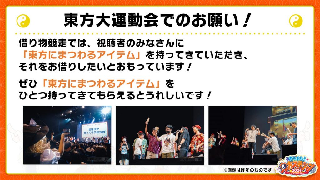 「借り物競争」では、ホールにお集まりいただいたみなさんがお持ちいただいた「東方にまつわるアイテム」を持ってきていただき、それをお借りしたいと思っています。ぜひ「東方にまつわるアイテム」をひとつ、持ってきてくださいね!