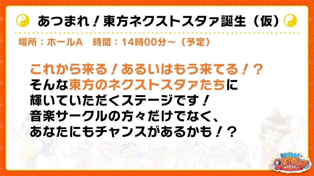 これから来る!あるいはもう来てる!? そんな東方のスターたちに輝いていただくステージです。音楽サークルの方々だけでなく、あなたにもチャンスがあるかも!?