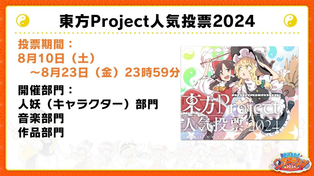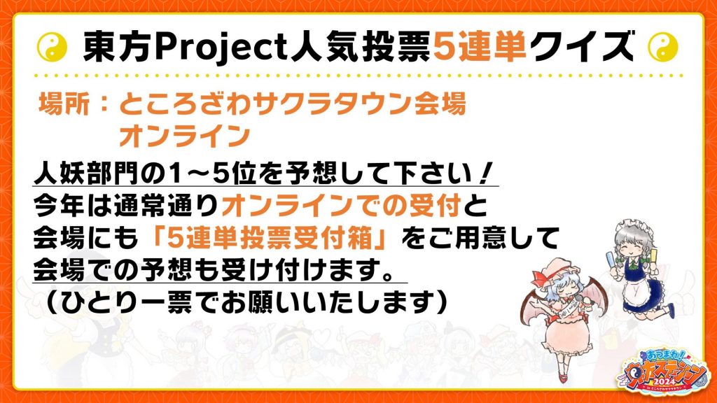 今年はなんと「東方Project人気投票」の開票をこの会場で行います。果たして今年は誰が1位になるのか……その瞬間をみんなで見届けましょう!